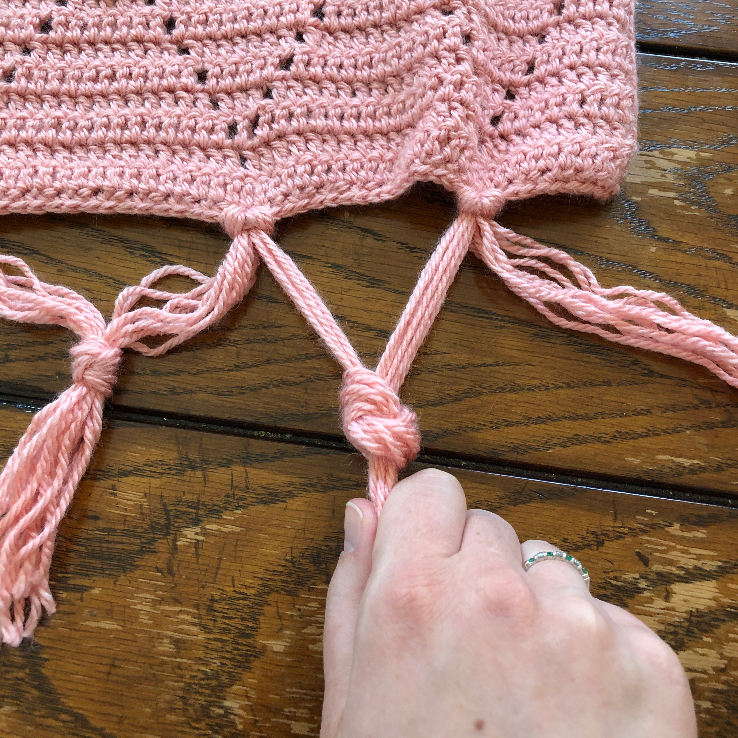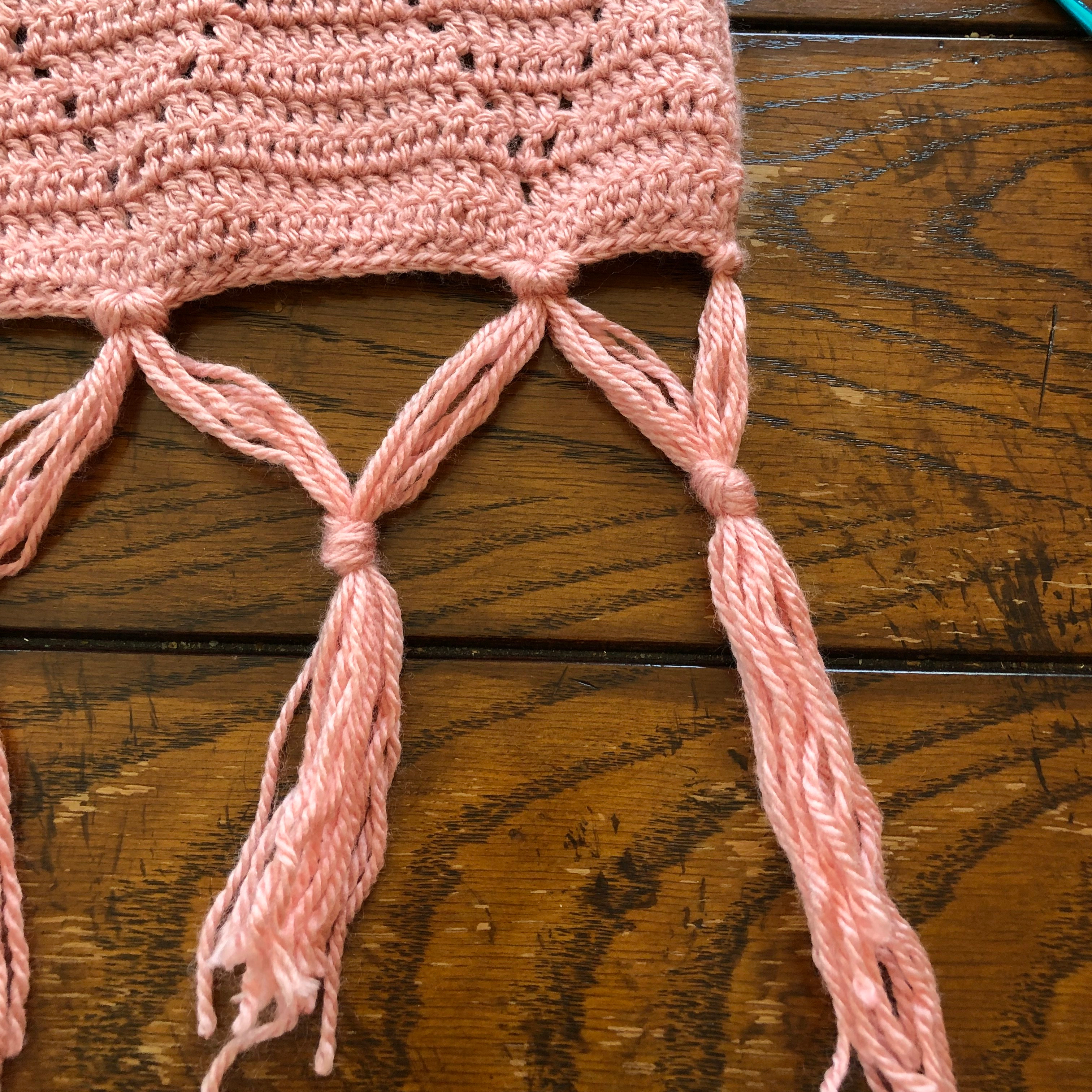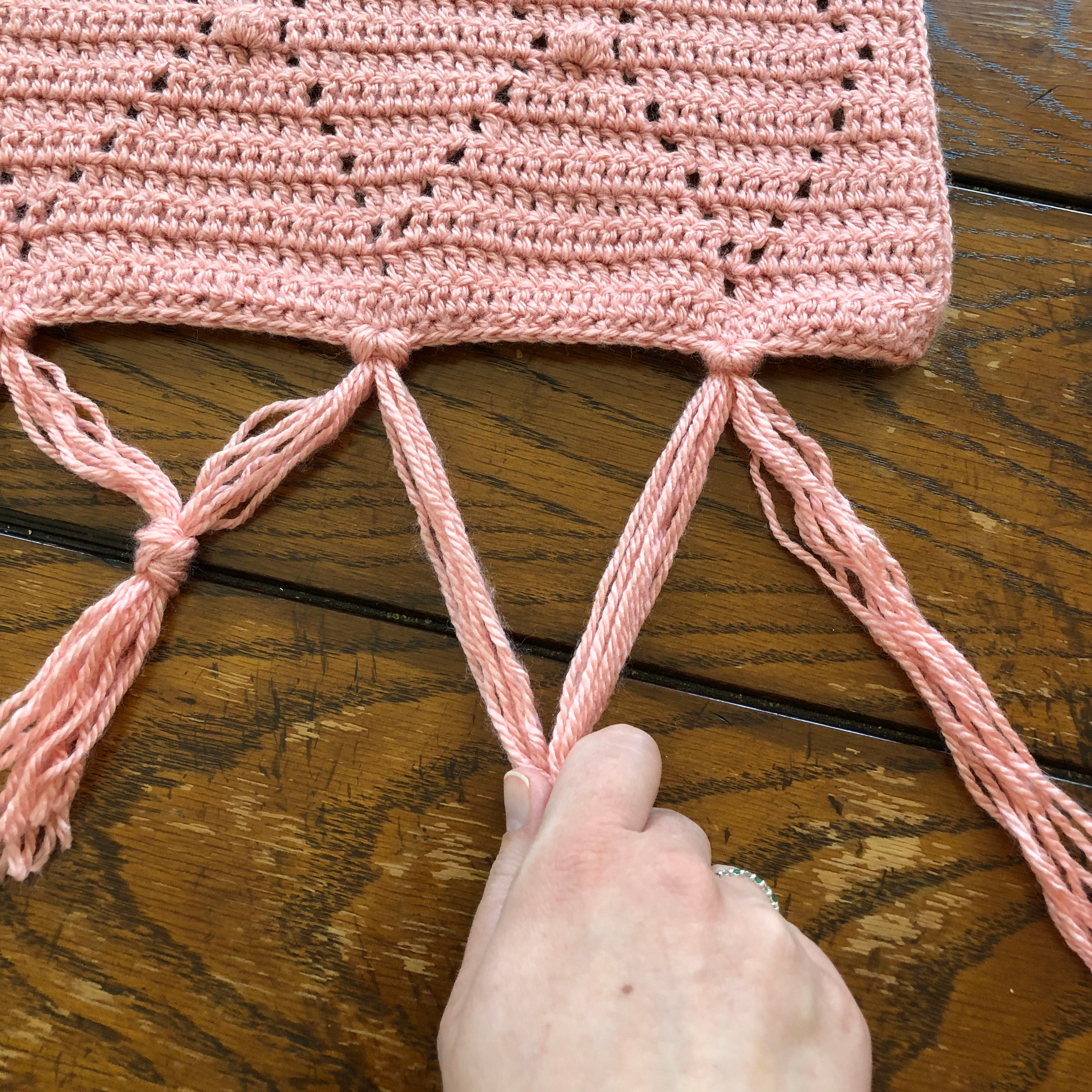 On each end of the blanket, insert and attach 4 strands. At the base of each diamond (you will have a ch 1 sp from the border to insert into) insert and attach 8 strands. Using 4 strands from each tassel, tie a knot to secure half of one tassel to the tassel next to it (see pictures). I recommend twisting the yarn before tying to help secure it and make it look neat. (This isn’t shown in the pictures below, but you can see it in the pictures of the finished blanket!)