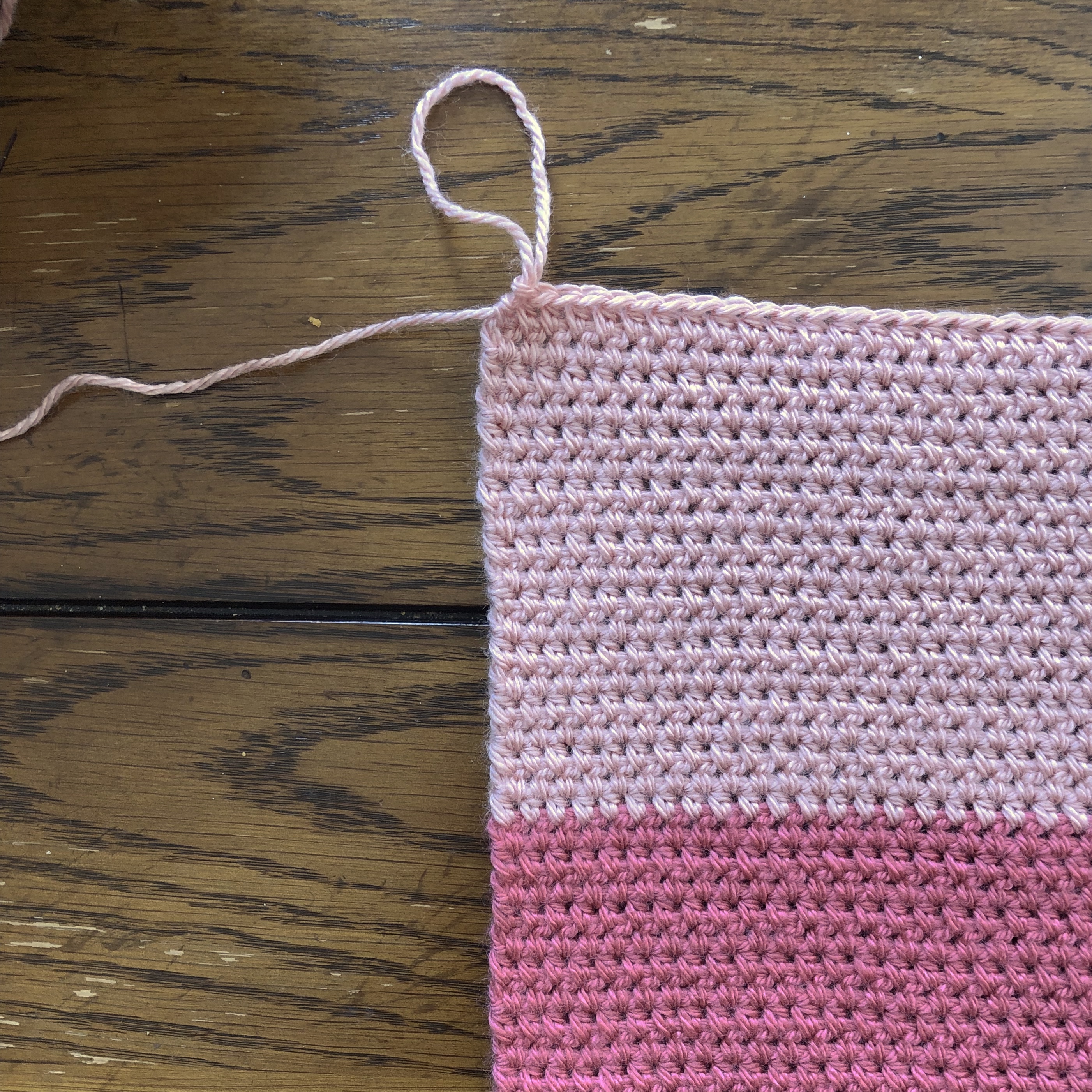 Let me just stop here and tell you that I completely frogged this thing at this point. I was chaining 2 for my turning chain after each row, but my edges were wavy and I couldn’t take it. I spent some time convincing myself that it was fine (which is why I got so far before frogging! ugh), but once I finished my second color I laid it down and just cringed. I undid the whole. entire. thing. My second time around I chained 1 at the end of each row, and it made SUCH a difference. To be honest I usually end up chaining one less than what is “standard” (I ch 2 for a double crochet). I’m not sure if it’s just my tension or what, but it’s always worked out better for me.