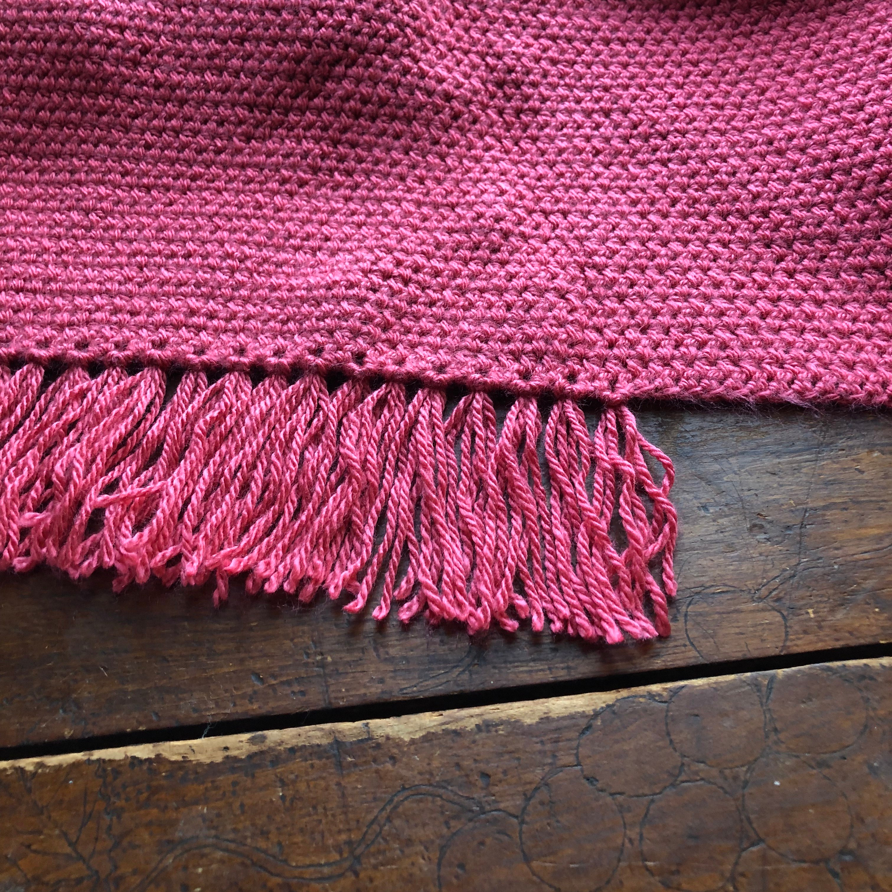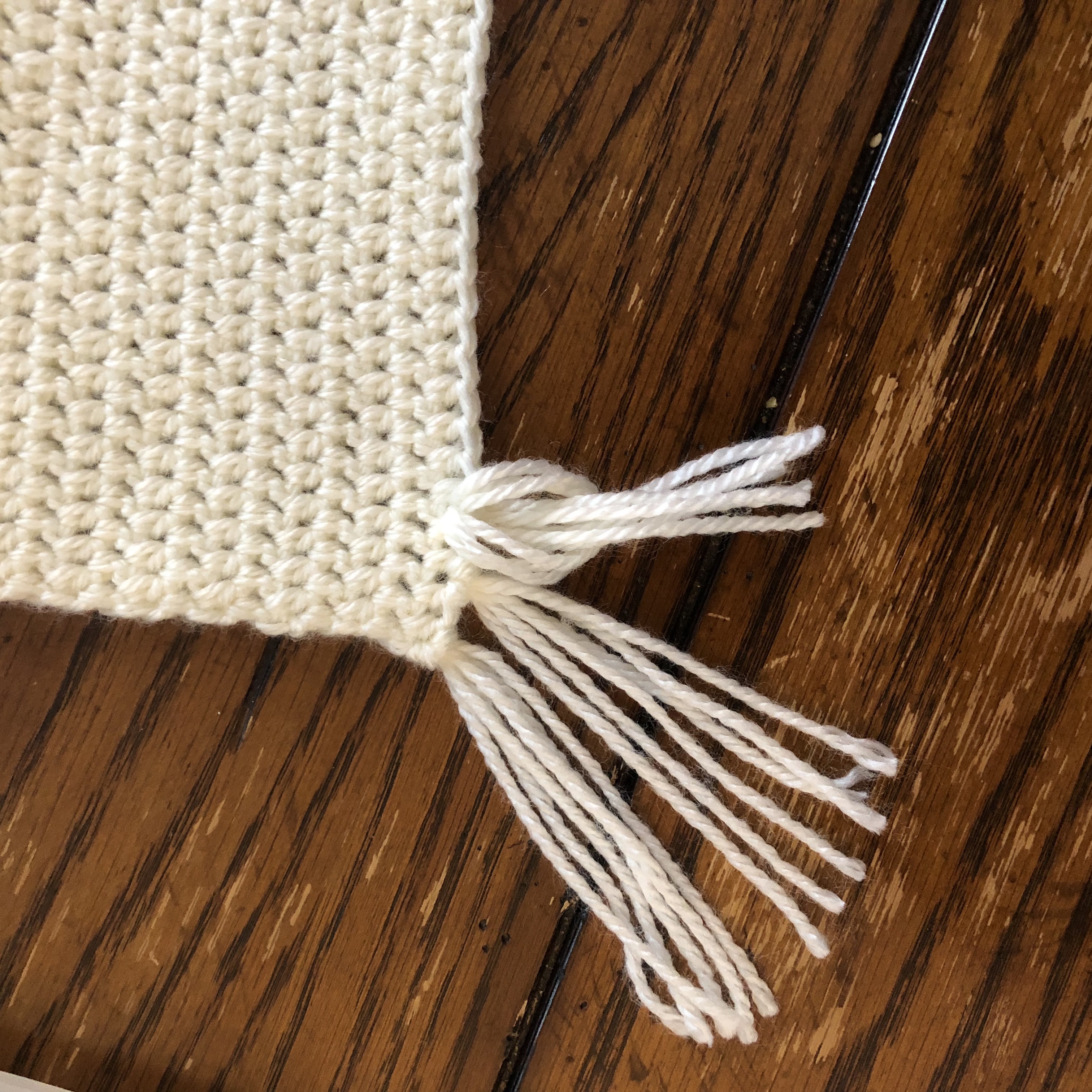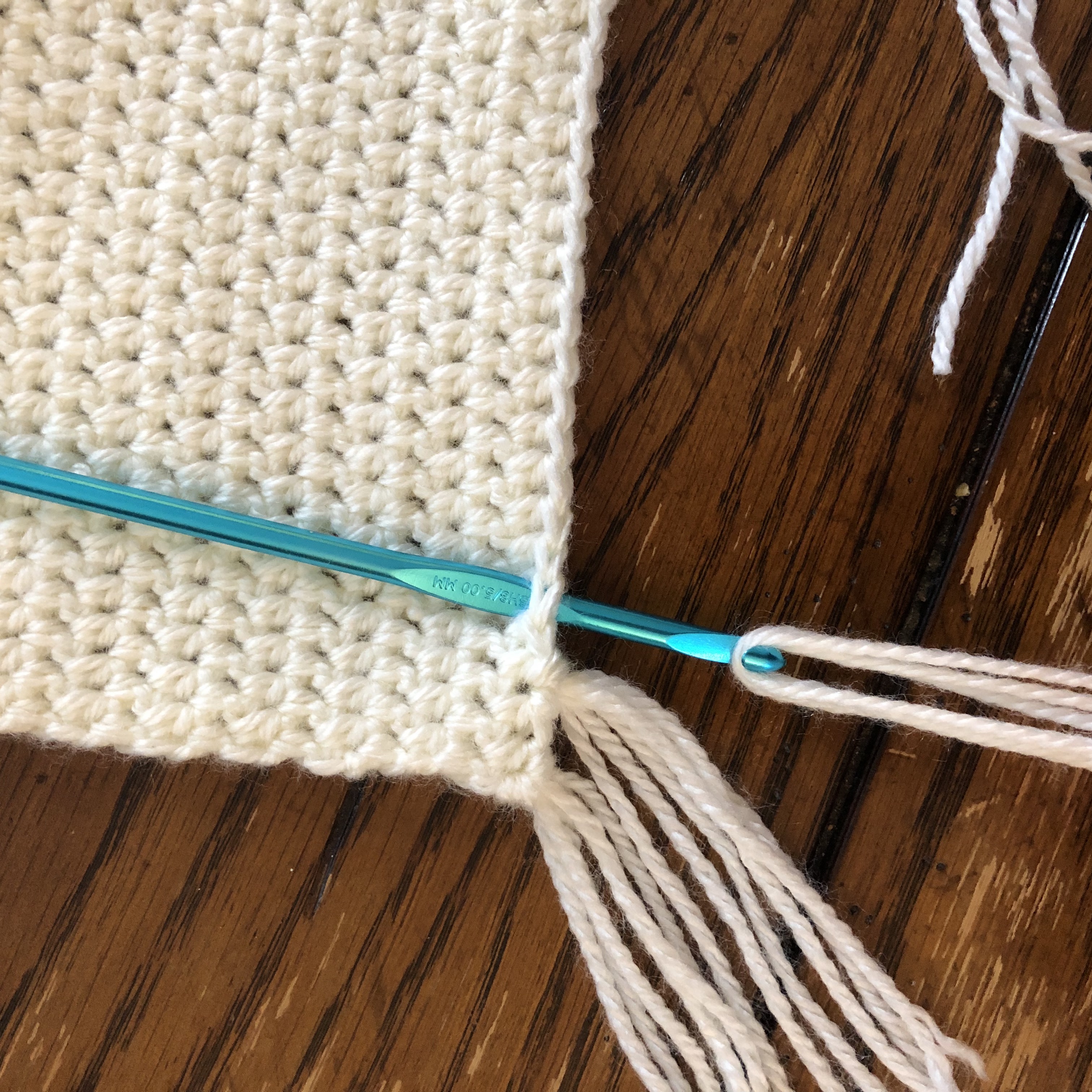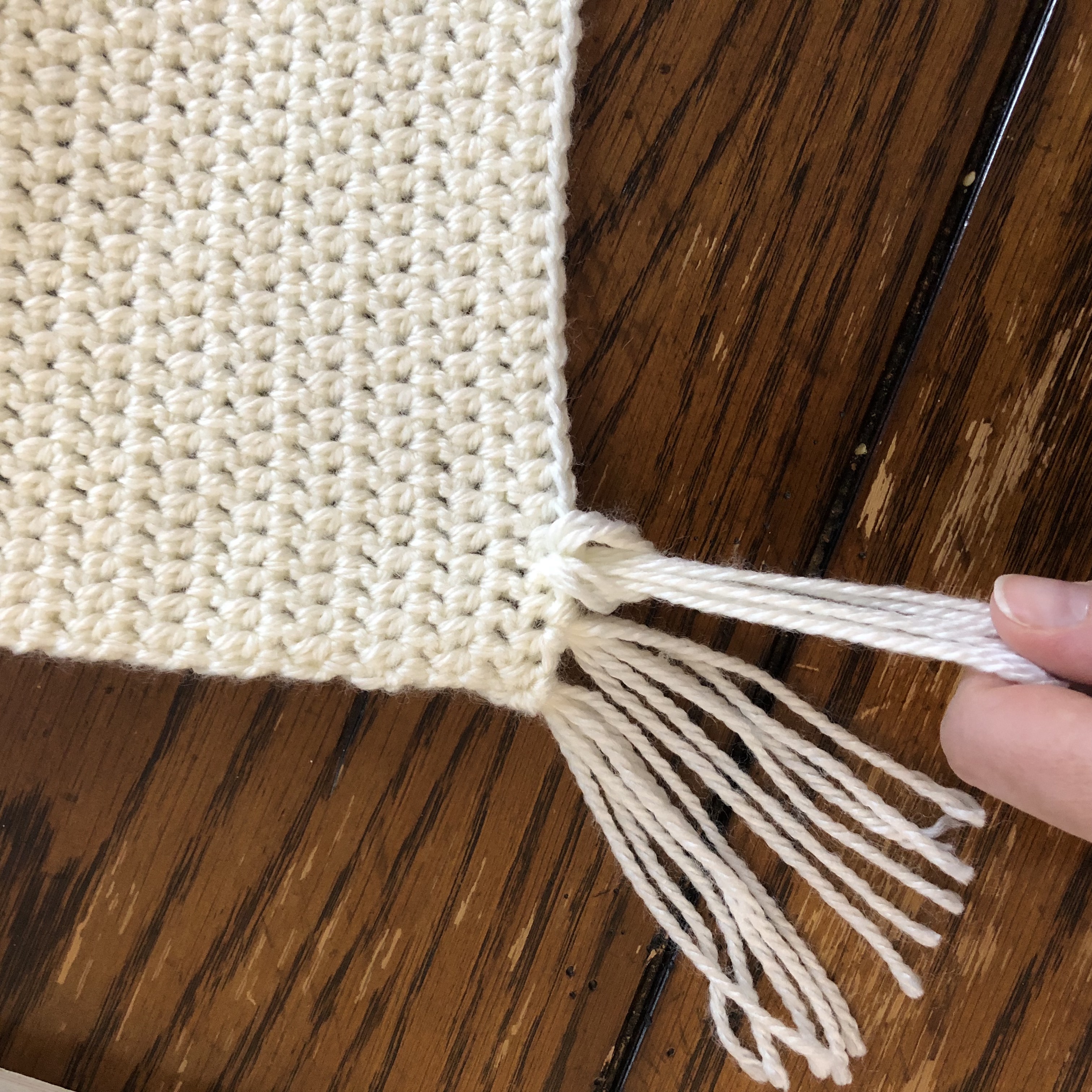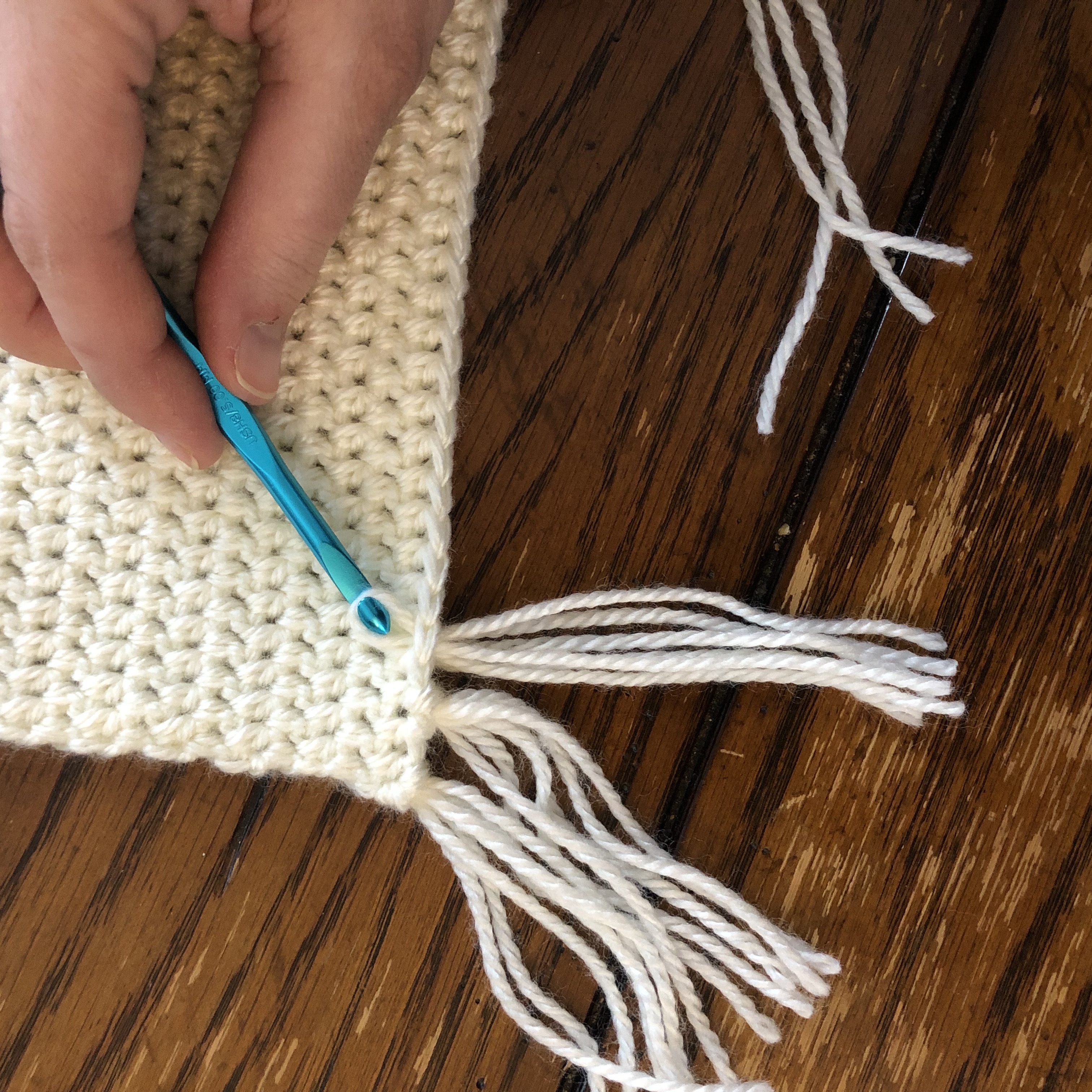Fold 3 strands in half and insert the loop into the space between hdcs in your first and final rows. Start in the second stitch, and attach a tassel into every other stitch until you reach the end. Repeat for the other side.