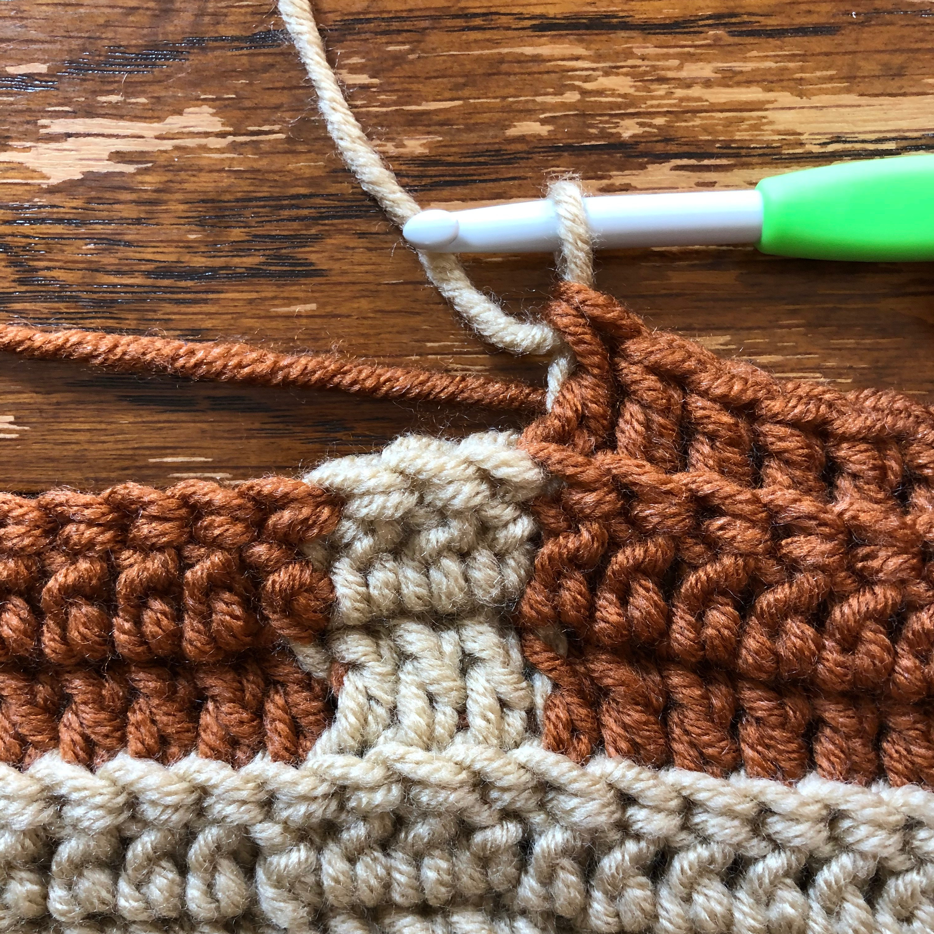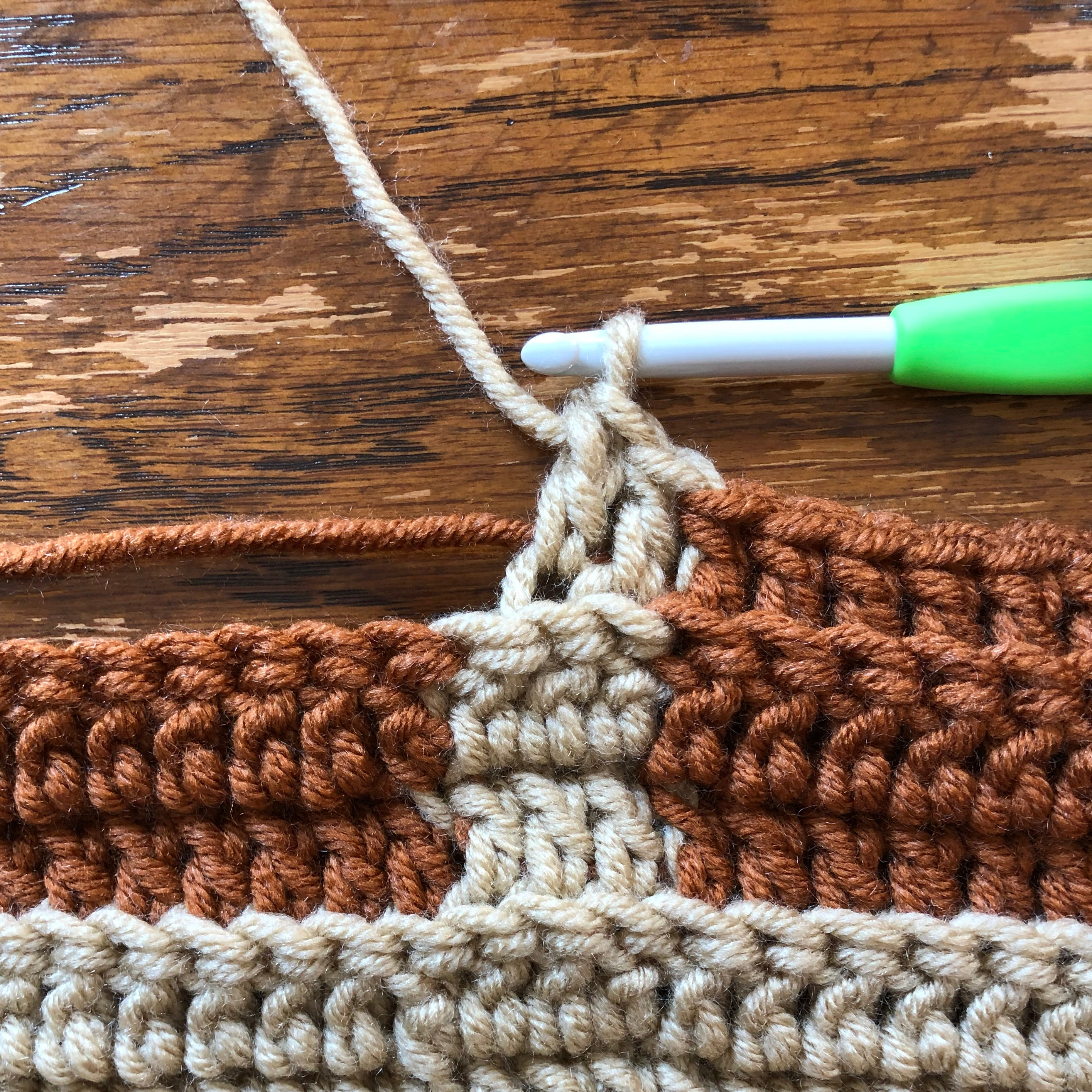Using Color 1, *begin a dc, but do not yo and pull through the second time to complete the stitch. For your last yo/pull through of the dc, drop your Color 1, pick up your Color 2 and pull through the two loops on your hook*. You will now have a loop of Color 2 on your hook. When you have completed the necessary stitches of Color 2, repeat * so that you finish with a loop of Color 1 on your hook.