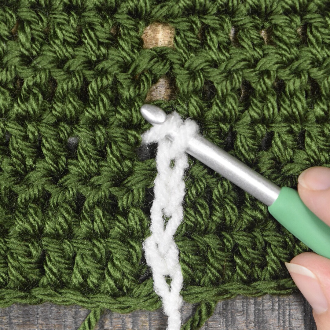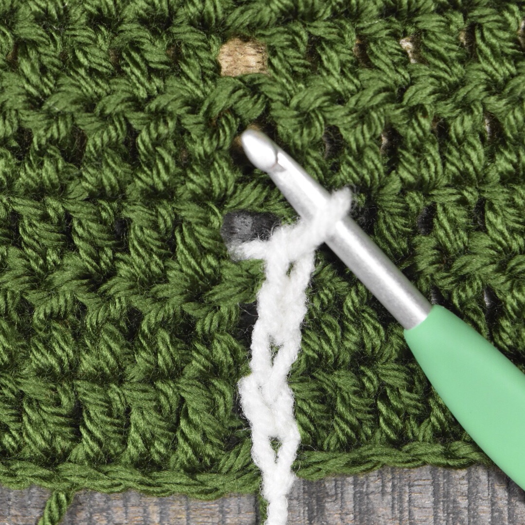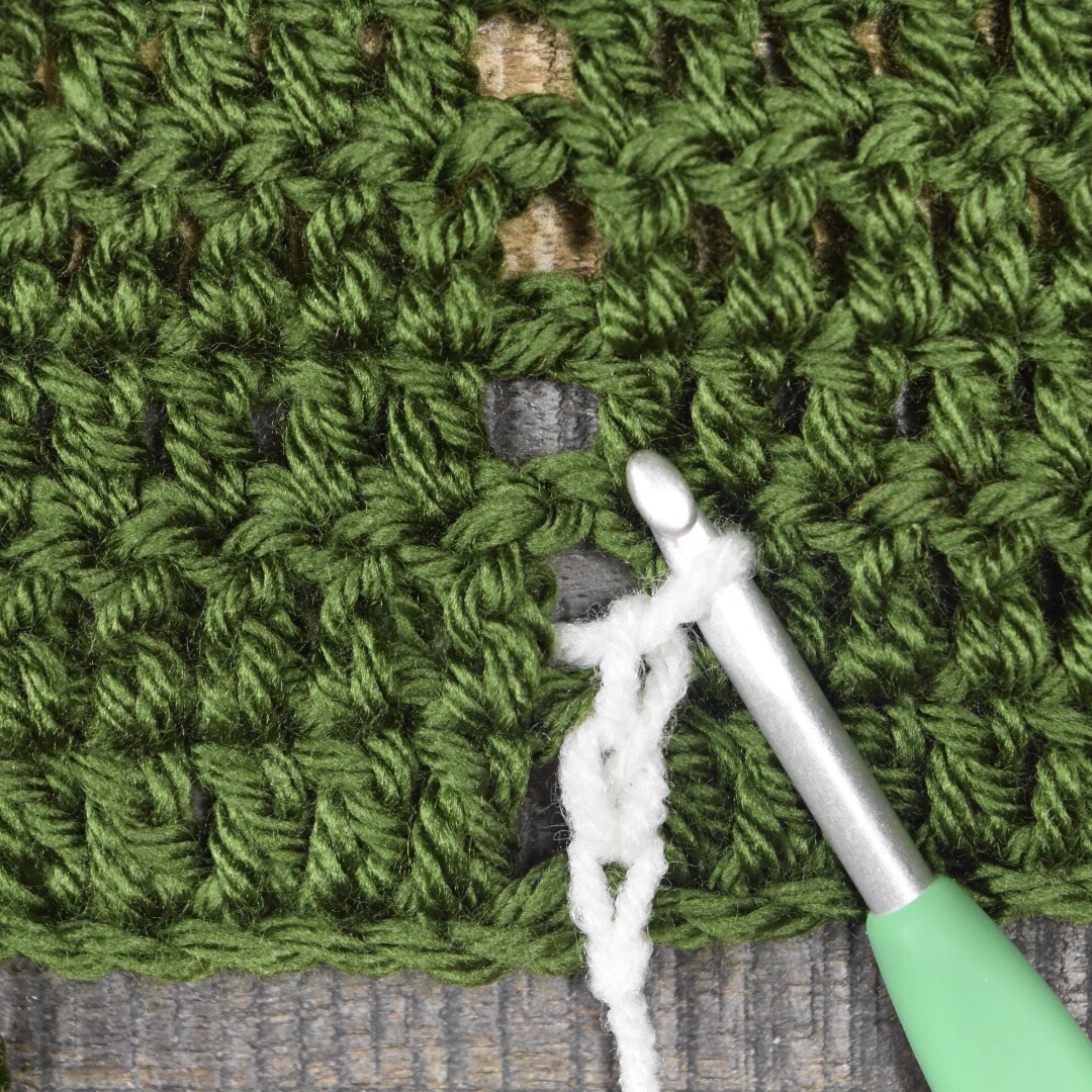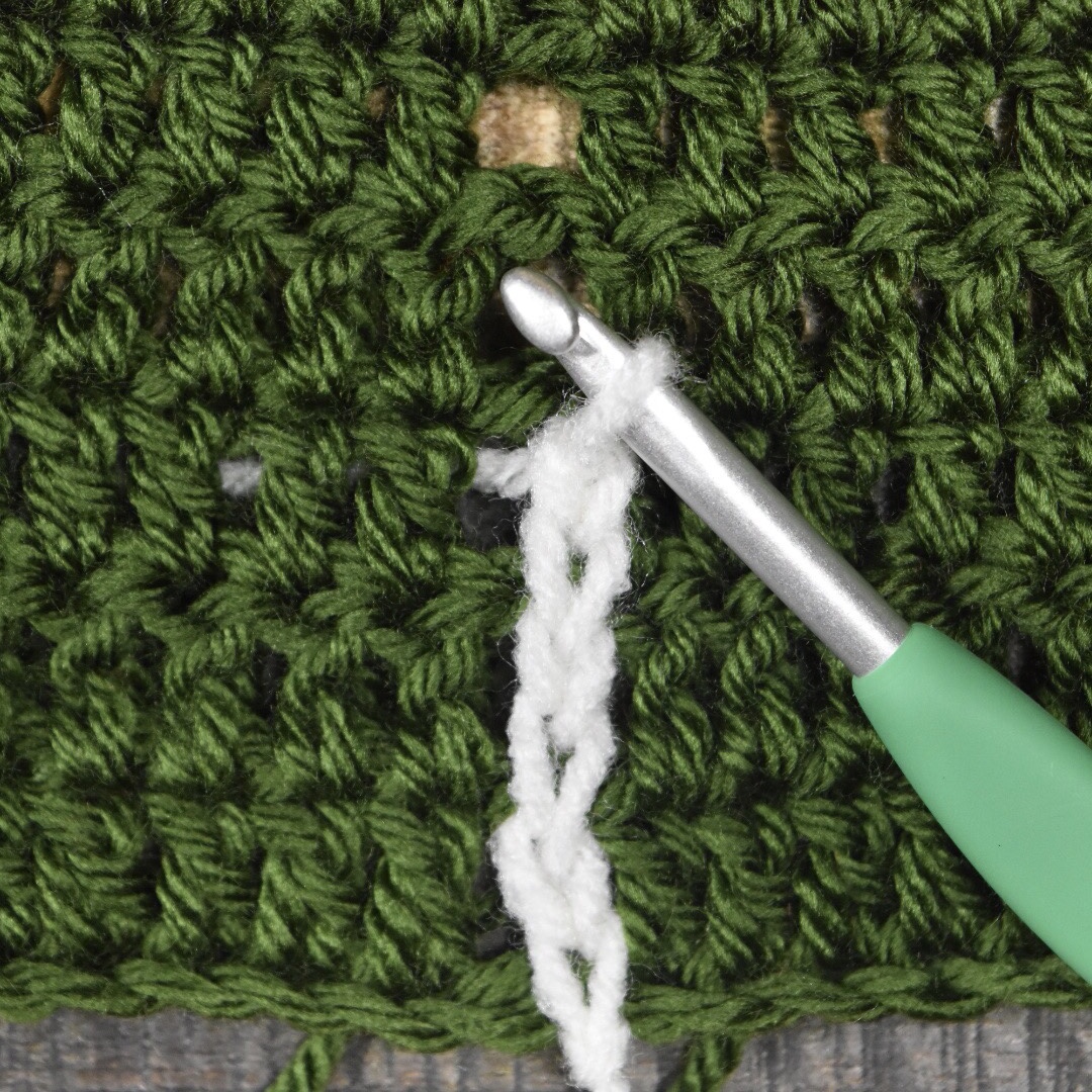 Hold the yarn beneath the body of your project, keeping your hook and loop above the project. Starting at the bottom, ch 1 into ch space on row 1 (yarn over and pull the yarn from behind the project to the front, and through the loop to create the chain stitch). Ch 1, again pulling the yarn from behind the project. *Ch 1 into ch space on the next row, ch 1.*