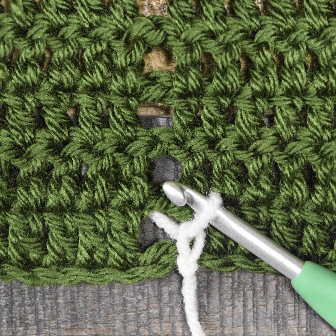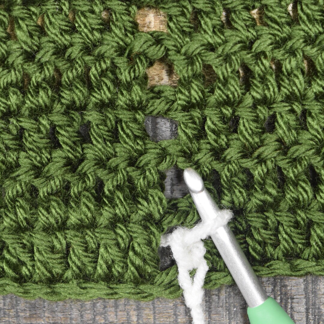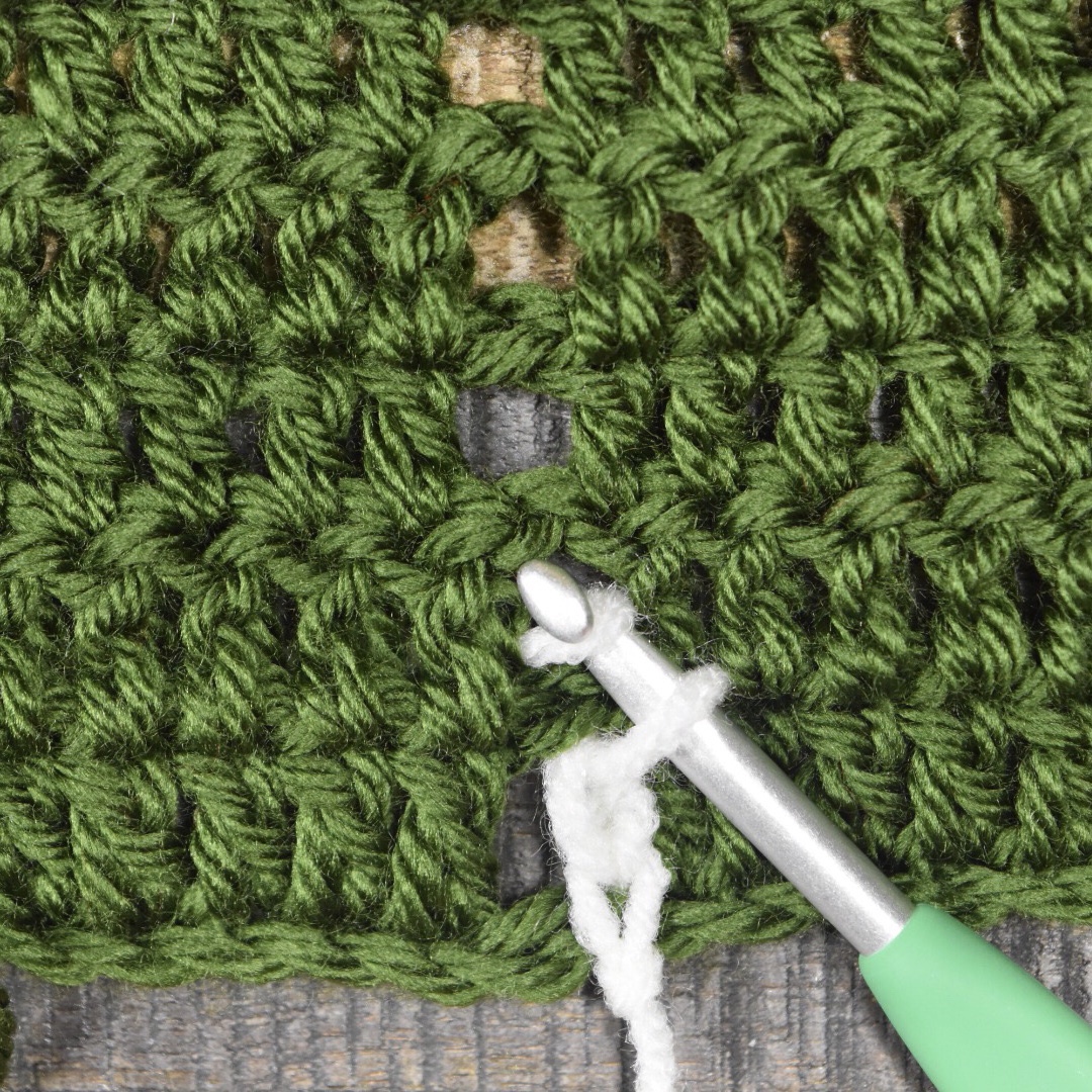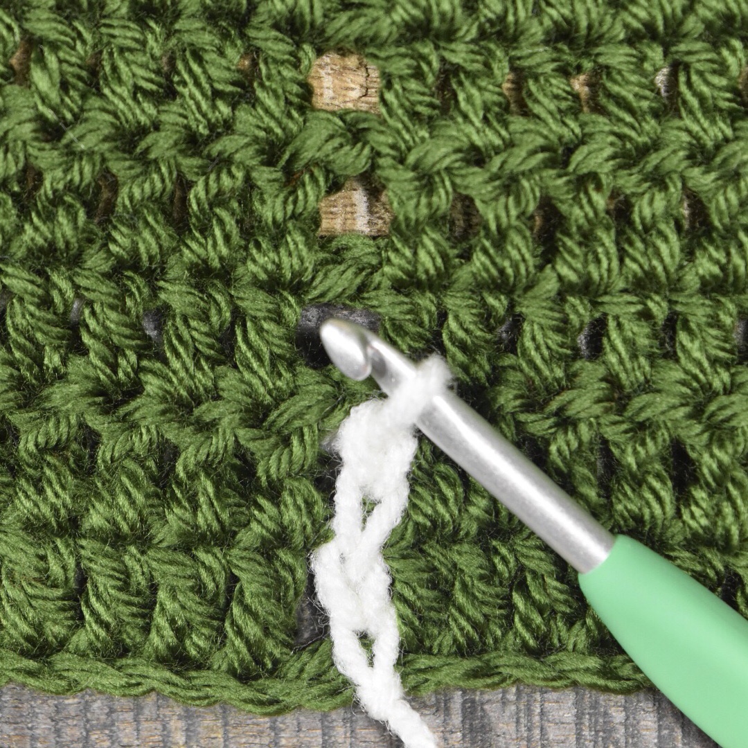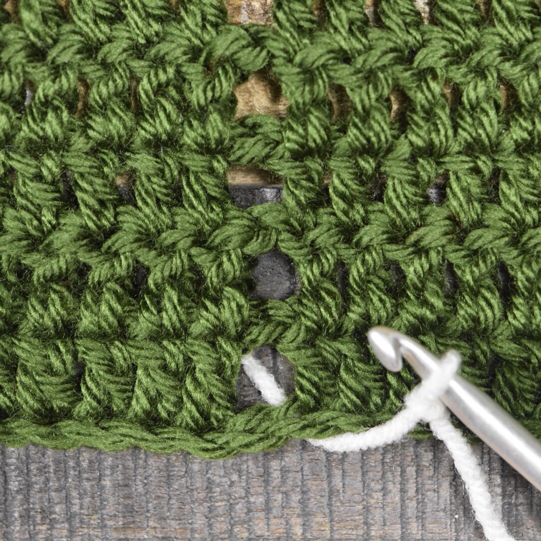 Hold the yarn beneath the body of your project, keeping your hook and loop above the project. Starting at the bottom, ch 1 into ch space on row 1 (yarn over and pull the yarn from behind the project to the front, and through the loop to create the chain stitch). Ch 1, again pulling the yarn from behind the project. *Ch 1 into ch space on the next row, ch 1.*