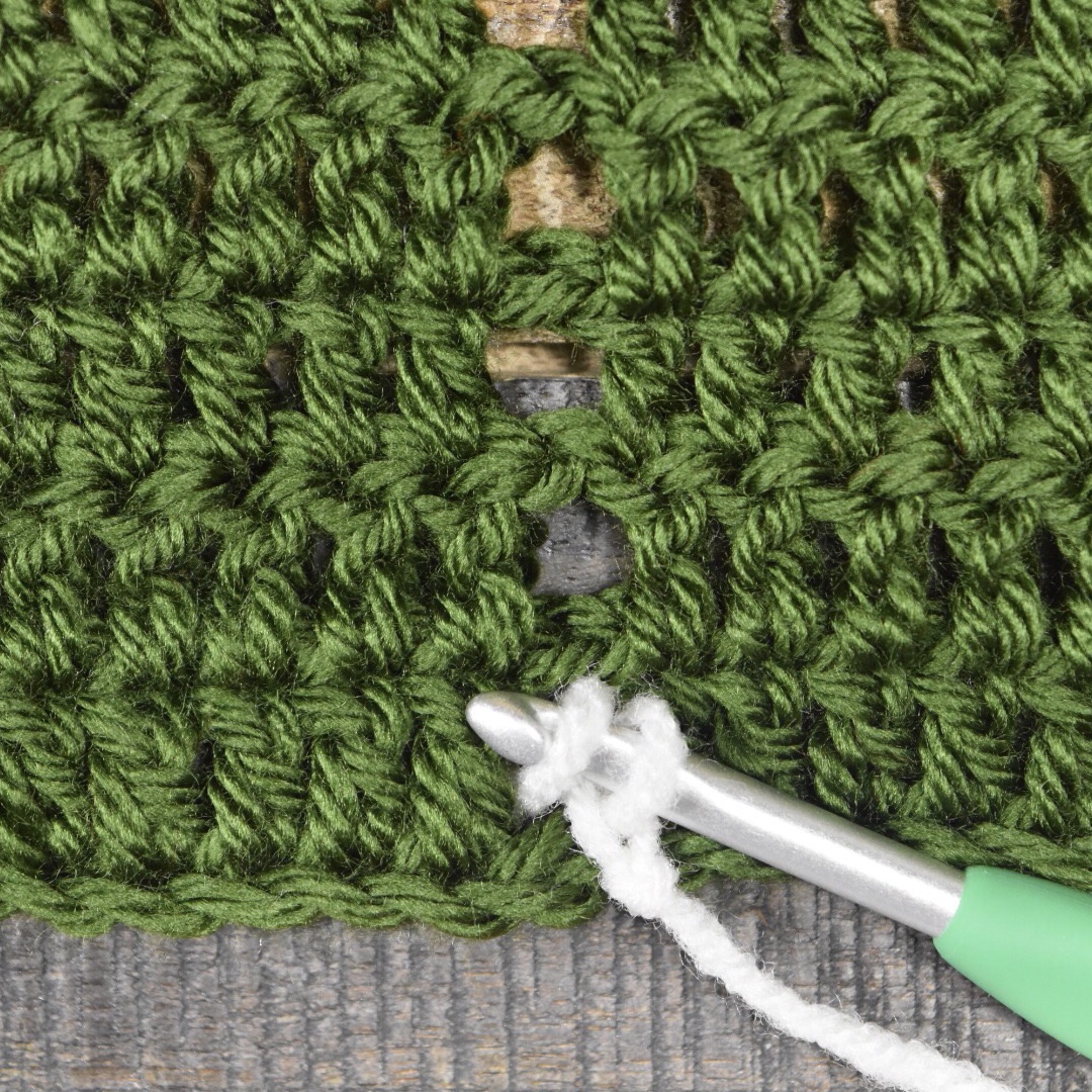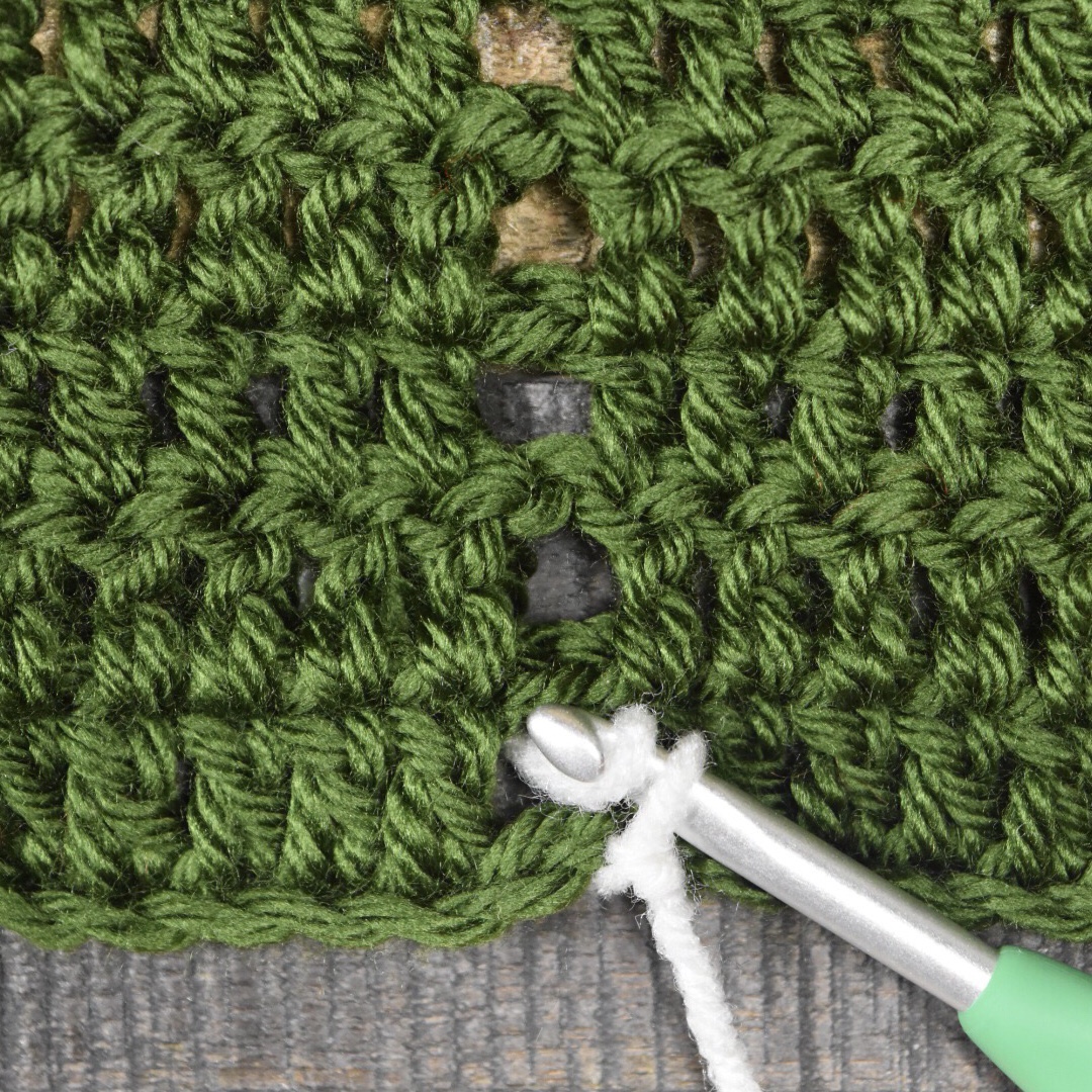 Create slip knot using your Color 2. Lay the project on a flat surface. Position your hook and yarn at the base of one of your ch sp columns.