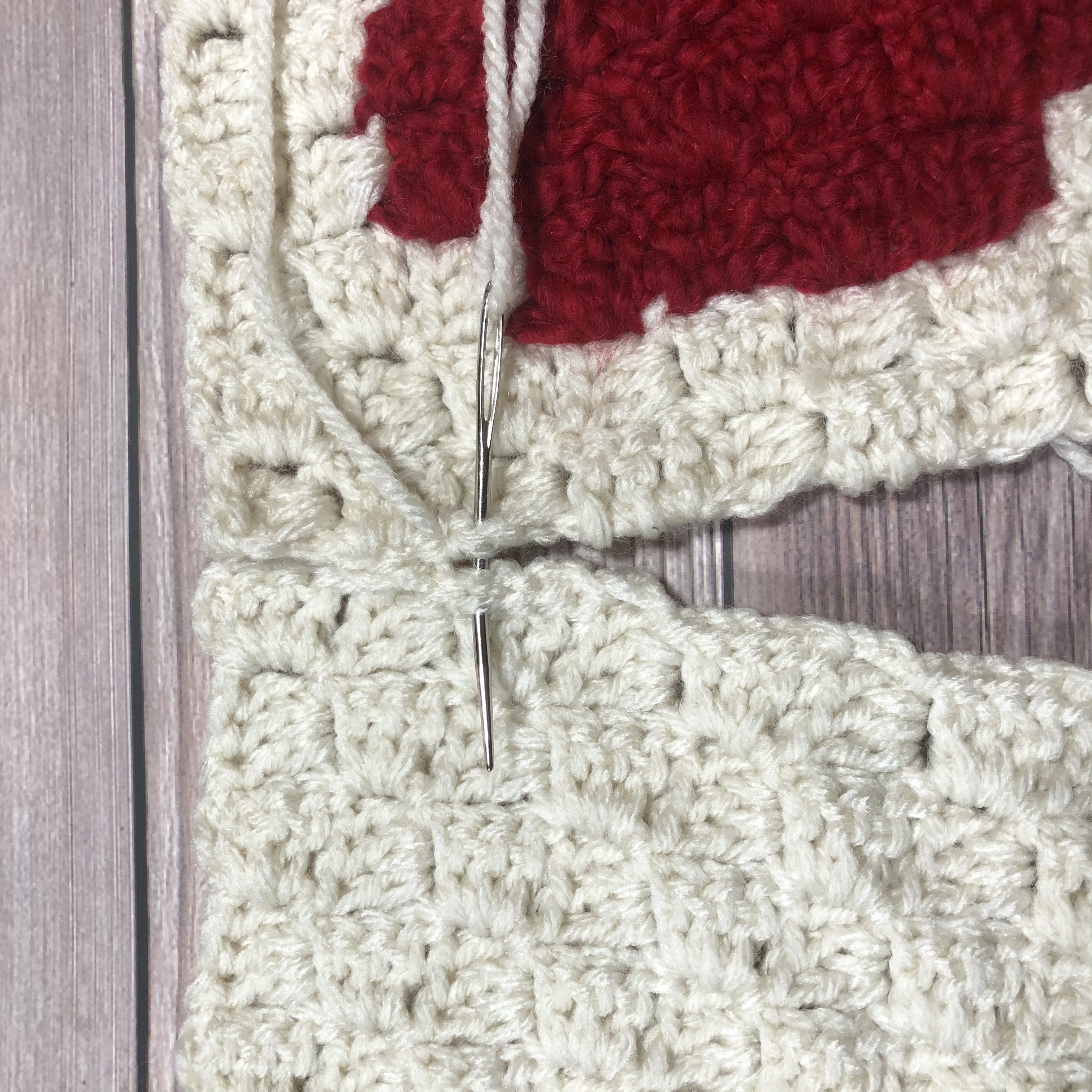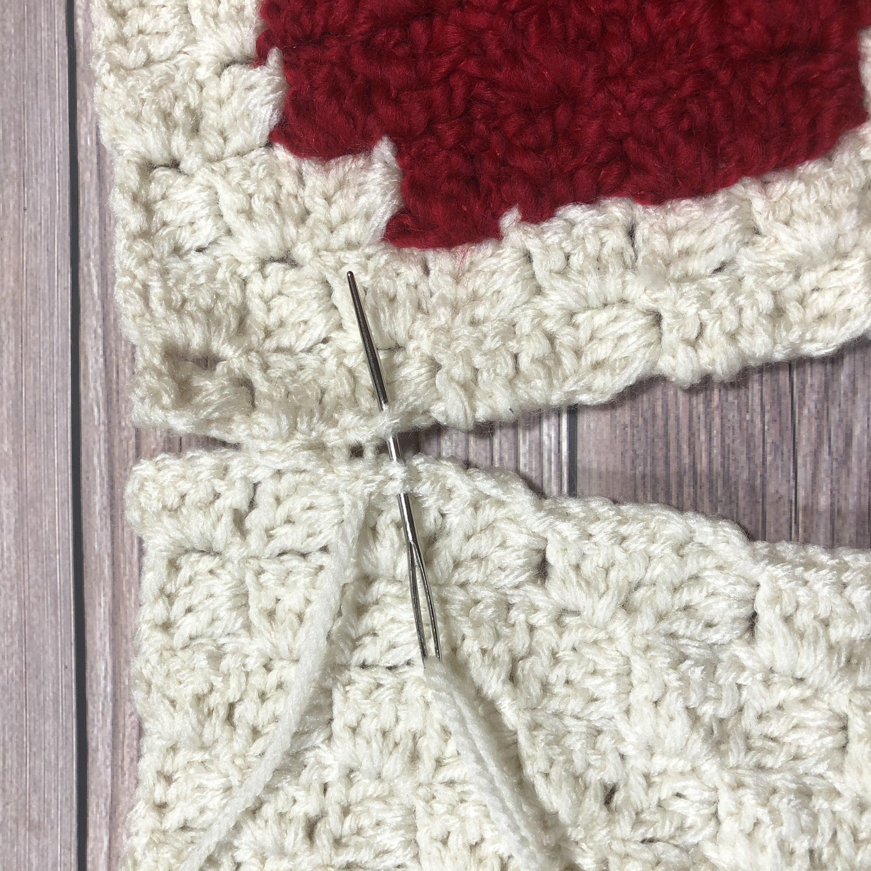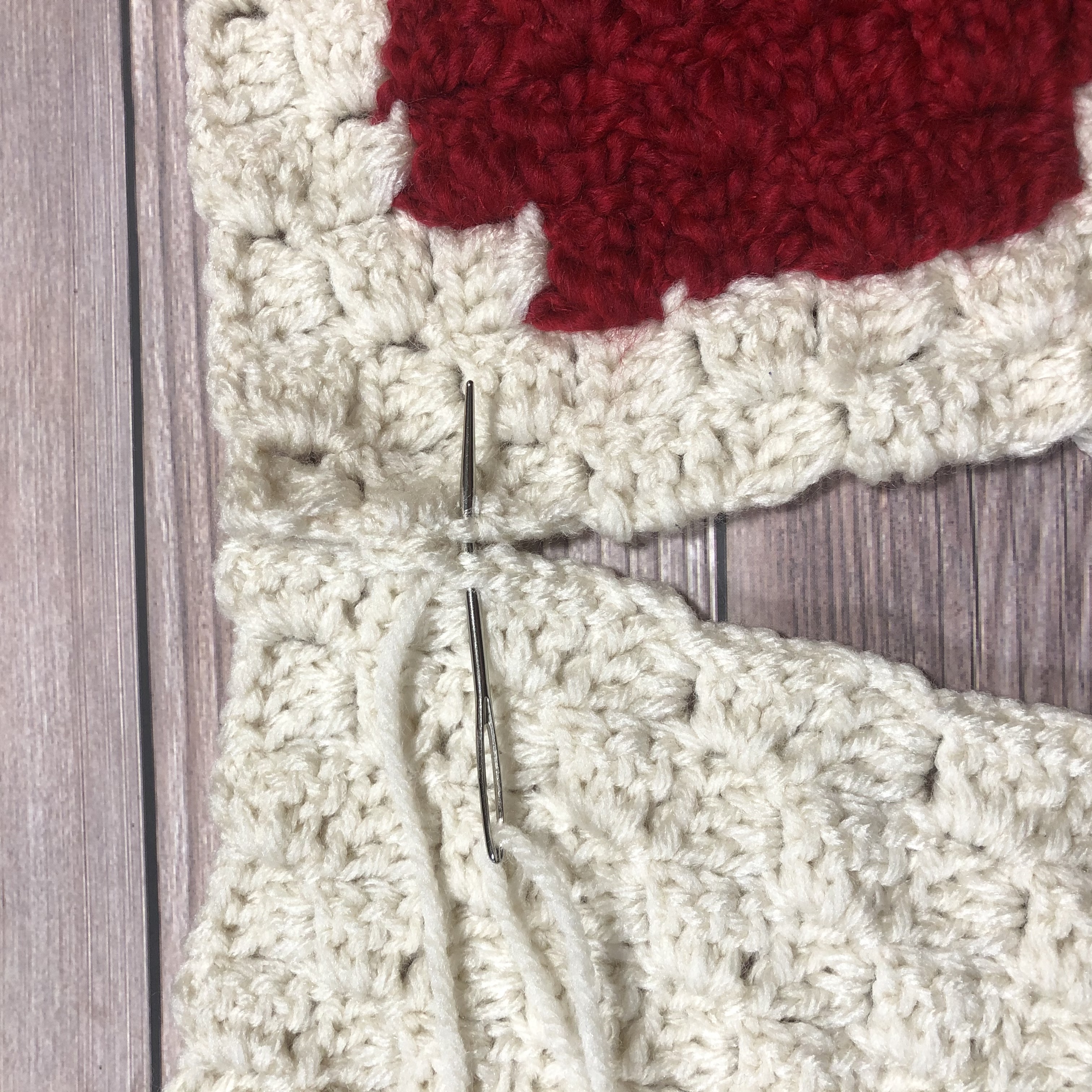 Starting in a corner, with your panels’ right sides facing each other, seam the first 3 sides of the panels together using a tapestry needle and the following technique: