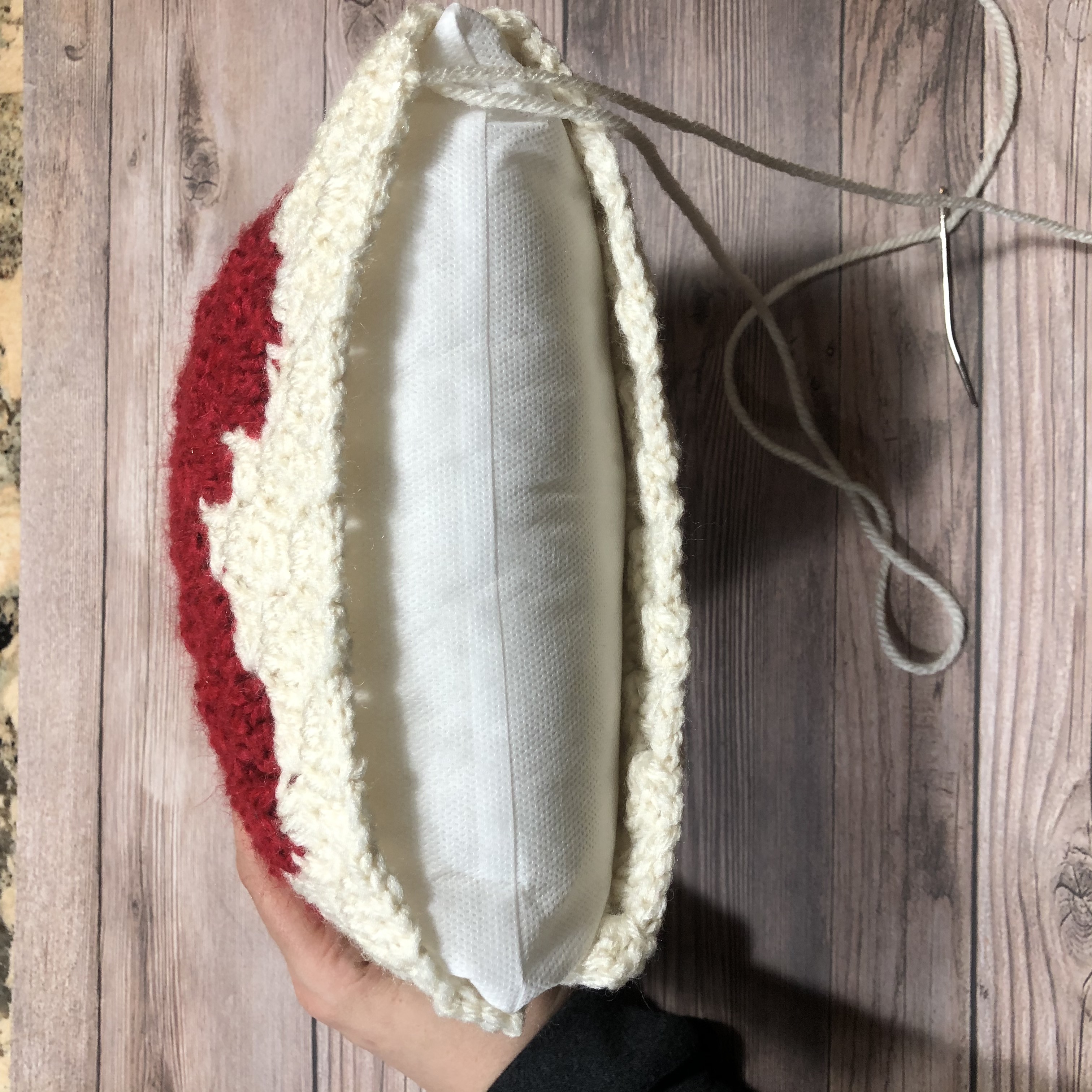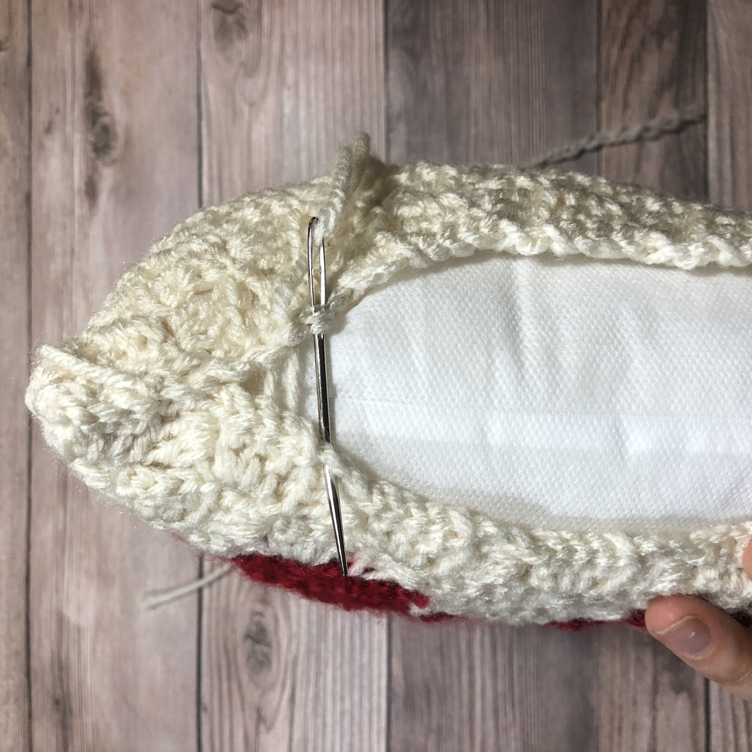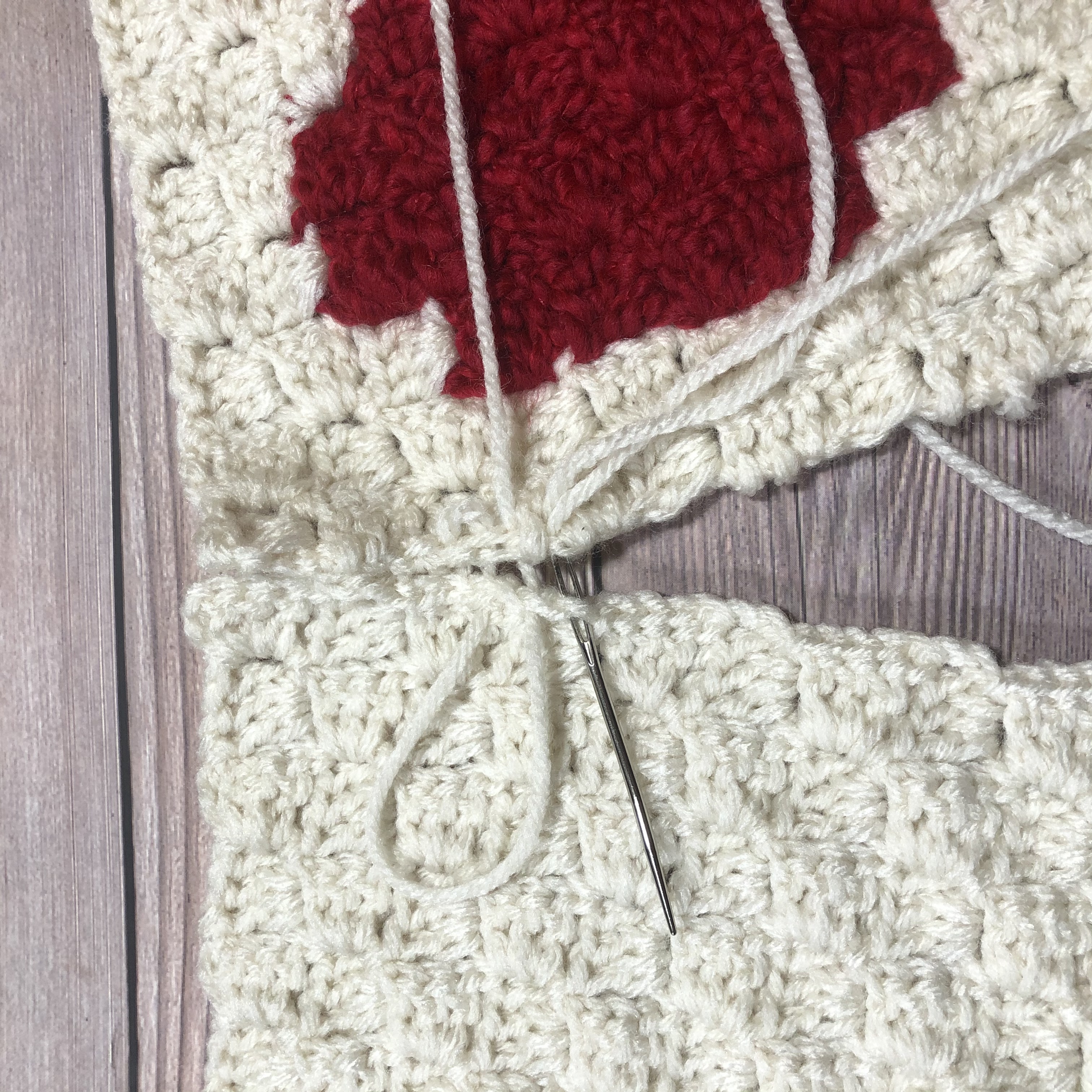 Starting in a corner, with your panels’ right sides facing each other, seam the first 3 sides of the panels together using a tapestry needle and the following technique: